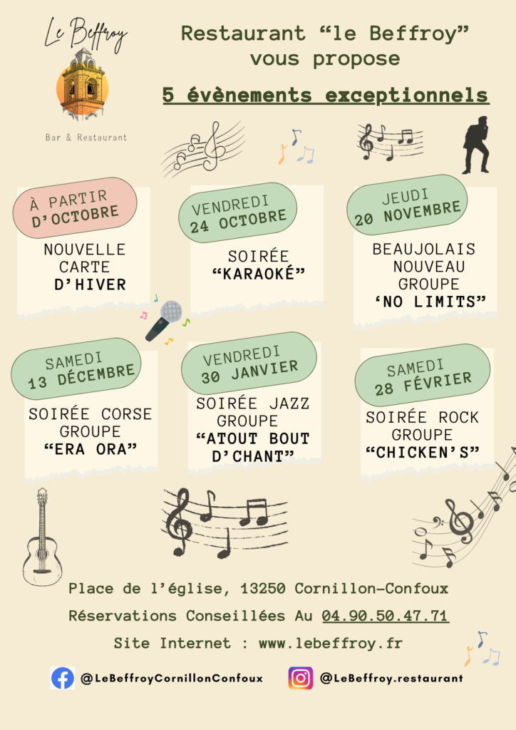 Le restaurant Le Beffroy vous donne rendez-vous tout au long de la saison pour 3 soirées exceptionnelles placées sous le signe de la musique, de la convivialité et du plaisir gourmand !