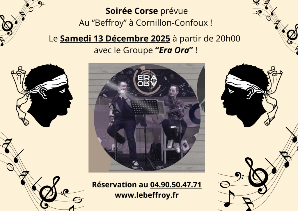 Le Beffroy vous emmène en Corse le temps d’une soirée ! Tous les trimestres, nous organisons une soirée Corse avec un menu typique, inspiré des saveurs de l’île de beauté. Au programme : charcuterie corse, fromages locaux, figatelli, pulenta, et desserts emblématiques.